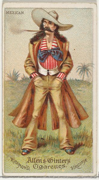 This is a chromolithograph titled "Cockney", created by Allen & Ginter for their "World's Dudes" cigarette card series. Here, the company employs the visual language of caricature to depict a working-class Londoner, or Cockney. Note how his clothing exaggerates the fashions of the upper class, while the bouquet and umbrella add a touch of affected dandyism. However, this image isn't merely about style. It's about social mobility and class anxieties in the late 19th century. This figure embodies a tension: a performance of aspiration, but is perhaps undercut by the slightly mocking tone of the print. Consider how the card caters to a specific consumer: someone who enjoys smoking and possesses a certain social outlook. As you reflect on this image, think about what it reveals about the complex relationship between identity, class, and consumer culture.