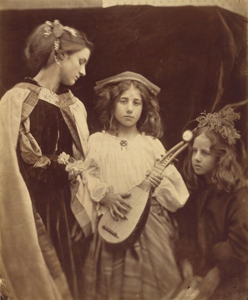 Captured by Lewis Carroll, this photograph presents Flora Rankin, Irene MacDonald, and Mary Josephine MacDonald in a tableau of Victorian girlhood. The garland of flowers adorning the central figure evokes ancient traditions, reminiscent of classical depictions of Flora, the Roman goddess of spring and fertility. Consider Botticelli’s "Primavera," where Flora scatters blossoms, a symbol of renewal and the cyclical nature of life. Here, the flowers intertwine with notions of innocence, beauty, and the transient nature of youth, a theme prevalent in Pre-Raphaelite art. The thoughtful gaze of the girls, combined with the floral motifs, hints at an underlying complexity. This composition taps into our collective memory, stirring subconscious recognition of archetypes. The garland, a recurring motif throughout art history, has resurfaced, evolved, and taken on new meanings, endlessly engaging viewers on a deep, subconscious level.