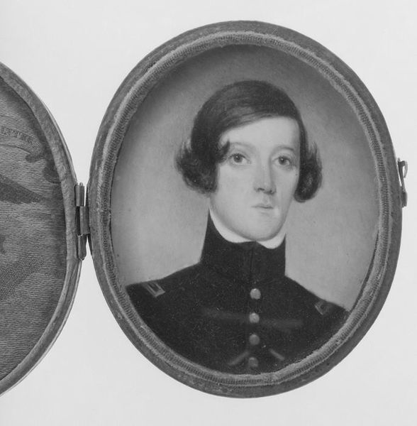This small portrait of Cyrus Mansfield is painted in watercolor on ivory by Samuel Morse. The oval composition, encased in what appears to be a locket, immediately draws you in with its intimate scale. Notice how Morse used the limited palette of blacks, whites, and grays to convey a sense of restrained elegance. The smooth, almost porcelain-like finish of the ivory support contributes to this effect. The subject's dark coat contrasts sharply with the stark white of his cravat, a visual strategy that directs your eye to his face. The precise, delicate brushwork speaks to a formal concern with line and contour. Morse's meticulous detailing invites questions about the sitter's identity, and also about the cultural codes of portraiture in the early 19th century. Consider how this small, personal object might have functioned as a signifier of status, affection, or remembrance. In its quiet way, this artwork prompts us to reflect on the complex relationship between image, identity, and representation.