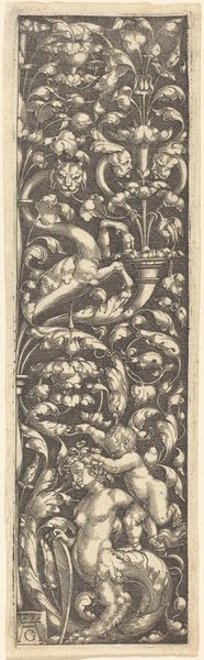This small decorative print, "Vlakdecoratie met bladranken en twee putti," was created by Gilich Kilian Proger, using engraving. The putti, or cherubic figures, are surrounded by lush foliage and evoke classical and Renaissance ideals. They reflect a fascination with innocence, beauty, and a utopian vision of harmony. However, these symbols were mobilized in diverse ways by those in power. During this period, such imagery often appeared in triumphal arches and garden designs, aligning with the cultural elite's self-representation. The details of the foliage and figures could symbolize themes of growth, abundance, and the cyclical nature of life. The putti, often gendered as male, historically embody a narrow representation of the human form, furthering complex questions about the politics of representation and identity. This artwork prompts us to consider the complex ways beauty, power, and identity intersect.