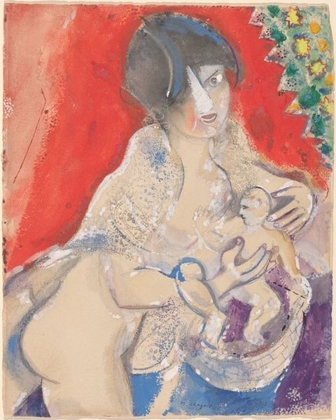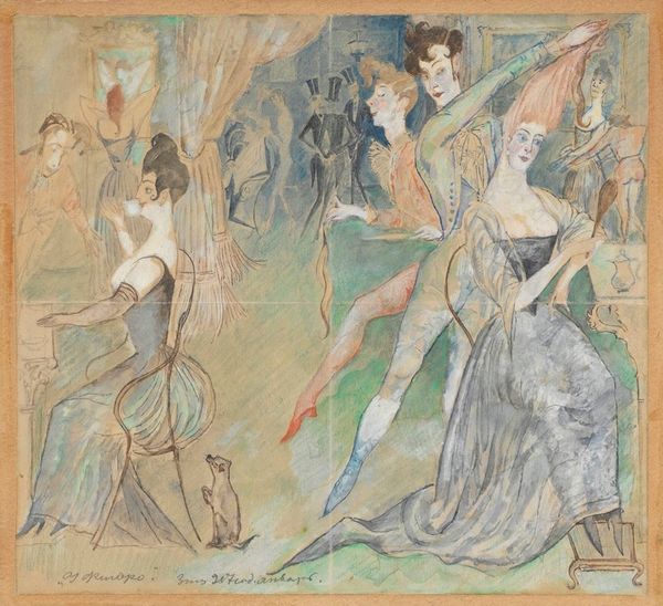 Editor: So here we have Kirchner's "Dancer," painted in 1914, in oil. My first thought is how the bold strokes and almost clashing colours give it such a vibrant, uneasy energy. It's not your typical graceful ballerina painting, is it? What do you see in this piece, something beyond just a dancer? Curator: Oh, absolutely not! It's buzzing, isn't it? Like a hive. I feel the pulse of the city, that frenetic energy, all captured in this one figure. Look at the sharp angles, the way he defines her – it's almost aggressive, a stark contrast to the softness we usually associate with dance. Do you notice how her eyes seem almost… knowing? Editor: Yeah, there's a definite edge to her gaze. And the two shadowy figures in the background... what do you make of those? Curator: Ah, the silent observers! I imagine them as fragments of her psyche, perhaps the expectations, the judgment, that constantly swirl around her. Or maybe they are the lingering gazes of a male-dominated audience? Consider also the art-historical context and the emerging, subversive avant-garde practices in 1914 in Germany. But does the setting or location impact your interpretation? Editor: I didn't initially think about that, but now I see what you mean; she appears caught in the flux of some liminal space that reinforces the psychological weight, her state of mind, in addition to her physical one. I never thought a ballet dancer could seem so… vulnerable, almost burdened. Curator: And yet, undeniably powerful! It is a potent visual summary of a new, fractured and dynamic age in Germany, captured through one performance, one performer. I guess what struck me initially was the fact that despite its jarring nature, I actually find her quietly inspiring and resolute in her purpose. Editor: Definitely. Thanks, that’s really given me a new appreciation for it, a whole different perspective, especially in seeing those figures not just as background elements, but facets of her inner world. Curator: It just reminds me to always look for those little unexpected layers within. Art can surprise, it seems, and teach, if we only make the time to contemplate it.