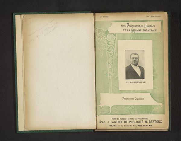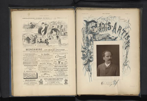 Curator: This is "La libre critique," dating back to 1902. What strikes you first about this print currently housed at the Rijksmuseum? Editor: Immediately, I’m drawn to its material form – a bound book, open to reveal a photograph embedded in the magazine layout. The contrast between the crisp photograph and the overlaid art nouveau typography highlights a negotiation between art and the burgeoning world of mass media and printed materials. Curator: Absolutely. "La libre critique" was a publication deeply embedded in the artistic and political debates of its time. The choice of photography here, a portrait of Edmond Picard, isn't just about representation; it's about leveraging his social and intellectual standing. He was a prominent lawyer and writer. Editor: So, the publication itself functioned as a vehicle for propagating ideas, using visual strategies to reinforce its critical voice? How did this particular format influence readership or perceptions of legitimacy? Curator: Consider the socio-political context. This was a period of significant upheaval, with questions of artistic freedom and political power at the forefront. The Art Nouveau design, intertwined with modern photographic reproduction, made it commercially viable. Its construction also positioned it as a cultural artifact of considerable weight in the art world and journalistic landscape. Editor: And who controlled its manufacture, circulation, and eventual consumption is central. The publishers of ‘La Libre Critique,’ they used a familiar form – the magazine – to spread and potentially democratize access to these intellectuals’ opinions. Were copies widely available? And did these mediums play a pivotal role in public perception? Curator: Exactly, and "La libre critique" sought a balance, attracting a literate but broad audience while showcasing artistic experimentation. In essence, this physical object is itself a record of how art, ideas, and socio-political forces converged. It reveals insights into both artistic expression and the dynamics of influence during that period. Editor: Right. Investigating its journey reveals complex decisions made regarding both dissemination and reception. Thanks to technological progress the masses had access. Curator: It really highlights the reciprocal exchange between culture, technique, and public imagination back then. Editor: Agreed, definitely some intriguing dynamics to explore.