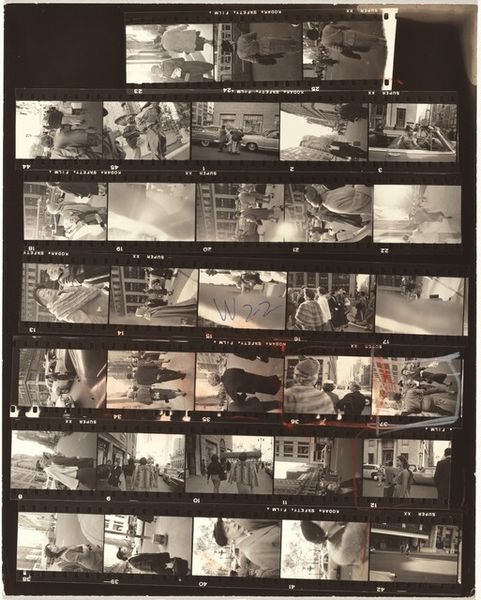 Editor: Here we have Robert Frank's "Andrea's birthday--Parties no number," from around 1958, a gelatin-silver print featuring several strips of negatives. The visible film sprockets add a gritty, documentary feel. I’m immediately drawn to the imperfections; it feels very raw and personal. What layers do you see within these assembled strips? Curator: It’s tempting to view this piece as simply a compilation of images, but Frank’s arrangement suggests a deeper narrative. How might we consider these specific moments – a birthday, street scenes, cars – within the sociopolitical context of 1950s America? The decade was defined by social and political conformism; the threat of communism and fear permeated American society. What is the photographer trying to show here about race or politics in that moment? Editor: Well, looking at the street scenes with the children and cars, there's this sense of everyday life, but then you've got the more intimate images. I'm struggling to see how those themes all coalesce into one narrative. Curator: Precisely! Consider how Frank, a Swiss immigrant, was navigating and critiquing American culture through his lens. The street photography juxtaposed with personal moments begins to reveal both the perceived stability and underlying tensions of the time. Where does the photograph capture tensions and challenge power relationships? Editor: So you’re saying the film strips work almost like a deconstructed story, highlighting both public and private experiences? And the graininess or supposed 'imperfections' push against this idealized image? Curator: Exactly. Frank is offering a counter-narrative, exposing the undercurrents of American society often glossed over in mainstream media. It encourages us to question whose stories are being told, and how. Editor: That completely shifts how I see it. It’s not just a collection of images, but a commentary, almost a rebellion. Curator: Yes, by weaving together disparate fragments of reality, Frank urges us to consider the complex intersectionality of individual lives within broader social structures. He transforms photography into a potent tool for social commentary.