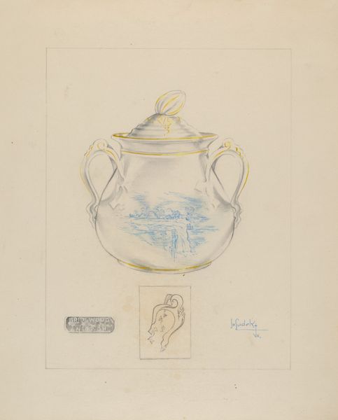 Editor: This is a "Design for Two Sèvres Porcelain Flower Pots," created in the 19th century. It looks like it was done with coloured pencil and print. It’s interesting how they contrast the cool blue with a warm rose-purple. The subject is precious, bordering on twee. What is your read on the cultural significance of the design? Curator: These pots offer a glimpse into a very specific moment. Sèvres porcelain was, and remains, a signifier of ultimate luxury. It's interesting to see a design featuring putti – these cherubic figures that evoke classical themes of love and innocence, don't you think? Editor: Definitely! They feel… a bit cliché. Curator: Precisely. These images speak volumes about the values of the 19th-century elite: a fascination with classical antiquity filtered through a lens of romantic sentimentality. The delicate floral arrangements amplify this sense of cultivated beauty and aristocratic leisure. Look at the detail in the gilded handles. Notice how they morph into stylized birds? Editor: Wow, I hadn't seen that before! Curator: Those gilded elements, the specific shades of blue and rose—all carefully calculated to project an image of refined taste and established wealth. They’re also designed to communicate that ideal of a kind of controlled, beautiful nature. It tells a story, doesn't it? What does the piece communicate to you now? Editor: Now I see the pots less as cliché and more as intentional cultural markers. It’s aspirational. These designs aren’t *just* pretty. They reveal something about a very particular audience. Curator: Precisely! By looking at the symbology, we see that the value of luxury items like these aren't just aesthetic or practical but deeply interwoven with complex cultural values.