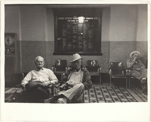 Curator: Robert Frank's "Two men--Omaha, Nebraska," taken in 1956, strikes me as intensely stark. There's a rawness that pulls you in. Editor: It's the texture of the silver gelatin print itself, isn’t it? That slight graininess emphasizes the grit of daily life. The high contrast and simple composition directs our eye directly to the men and their attire, which speaks volumes about class and labor in mid-century America. The manufacturing process allows for quick reproduction, expanding viewership... It makes it art that belongs to the street, really. Curator: Absolutely. What intrigues me is how Frank captures a specific moment in post-war American society, offering a window into social structures and the subtle power dynamics that existed. The older man is wearing a suit, looking rather tired; while the younger one looks on dressed down. You know, this reminds me a bit of some of the social commentary you'd see in the Ashcan School. Editor: You can really feel the pulse of that era. But look closely at their clothes – the crisp suit, the worn work shirt. Where were these clothes made, under what conditions, and by whom? The whole image brings these hidden networks of labor and commodity exchange into sharp focus. This image acts as a social document but only after its material construction allows it. Curator: Precisely, the everyday realities of ordinary citizens are at the heart of this photo, aren’t they? Think about the politics of representation here too. Who is given a voice? Whose stories are considered important enough to be preserved? Frank, though an outsider himself, provided a particular perspective, framing these men against a relatively empty background to tell something unspoken about this space and period of time. Editor: Yes, and thinking about photographic history, it also invites us to ask what makes photography art at all, doesn't it? How did Frank navigate the industrial processes required, in order to become "artist" rather than a simple "factory worker." It blurs lines by showcasing its construction so readily. Curator: That’s a compelling angle. This work then is far from just a snapshot. It’s a historical artifact and a visual commentary. Editor: Indeed. For me, this image isn't just about the 'who' or 'where,' but very much about the 'how' – the materiality and the labor that brought this commentary into existence in the first place.