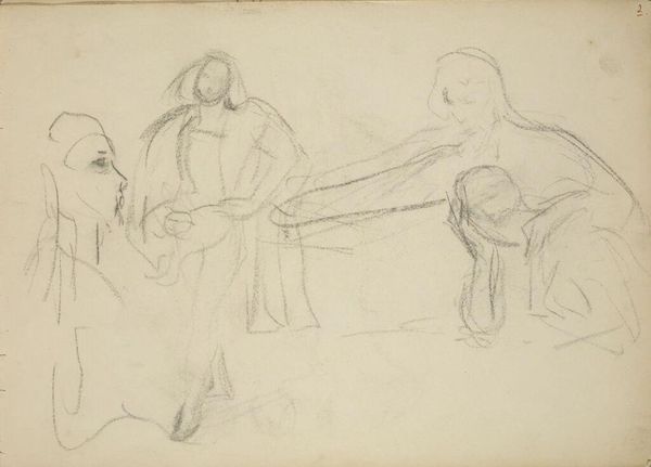 Pierre-Auguste Renoir created this drawing, Musiciens, with soft, dark lines that capture a fleeting moment. The entire composition is defined by the contrast between the solid figures and the undefined, atmospheric space around them, evoking a sense of immediacy. Renoir's focus here is not on detailed representation but on the interplay of forms. Note how the musician on the left, rendered with bold strokes, seems to emerge from the sketch, while the figure playing the guitar in the background blends into the surrounding space. This deliberate imbalance directs our attention to the formal elements, such as the sweeping curves of the musician's body. The incompleteness of the drawing encourages us to consider the nature of perception and representation. Renoir uses the sketchy, unfinished quality of the drawing to challenge our expectations. We are left not with a definitive image, but with a sense of the artist's process. This open-endedness invites us to engage with the artwork on a deeper level, recognizing that its meaning is not fixed but fluid, shaped by our own interpretations and experiences.