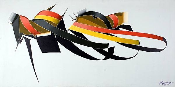 Burhan Dogancay made this painting with what seems to be bold strokes of acrylic, capturing movement with a limited, but eye-catching color palette. The process feels almost like a dance, a playful exploration of form and rhythm. Looking at this piece, I'm struck by the textures created through the layering of colors. The paint is applied both thinly and thickly, giving the ribbons a sense of depth and dimension. See how the dark purple ribbon weaves in and out, creating shadows and highlights that play across the surface? It reminds me of the way painters like Frank Stella constructed their pieces. Dogancay’s work has this kind of vibrant energy, embracing ambiguity and the joy of pure form. It's a celebration of how lines and colors can create a world of their own, and it's an invitation to let your imagination run wild!