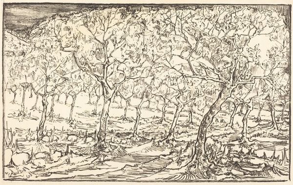 Louis Valtat created this landscape, "Paysage d'arbres," using etching techniques. The bare trees, almost skeletal, remind us of the vanitas tradition, symbolizing mortality and the transience of life. These are concepts deeply rooted in our collective consciousness. The image evokes a sense of melancholy, reminiscent of the "memento mori" seen in classical art—skulls, decaying fruit, and extinguished candles, all reminders of our inevitable end. The contrast between the stark trees and the implied fullness of the surrounding foliage suggests a cycle of death and rebirth, a constant flux. We are drawn to the primal symbolism of nature, a visual language that speaks to our deepest fears and hopes. In the grand theater of human existence, the trees serve as silent witnesses to the drama of life and death, echoing through time and art.