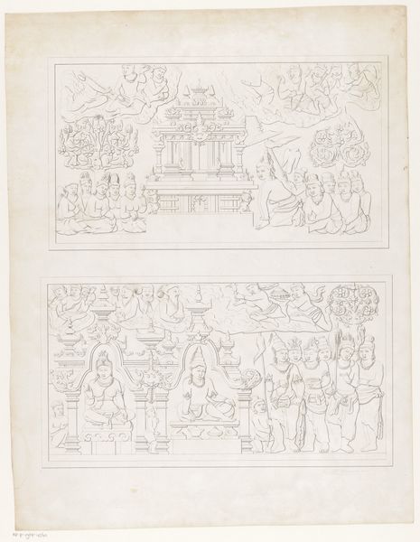 Curator: This whimsical piece is titled "Spotprent over Trakranen," dating back to 1867 and created by Johan Michaël Schmidt Crans. I’m immediately drawn to its starkness—the monochromatic ink drawing feels both detailed and dreamlike. The figures and architecture almost seem to float. What's your initial read? Editor: I'm struck by the explicit critique of power embedded here. The cartoonish rendering contrasts with a biting social commentary. It’s a performance—the state—staged and mediated for an audience. Look at the way the state shield almost dwarfs those meant to protect it! Curator: Exactly! The lithographic technique lends a certain vulnerability, like the whole structure could collapse at any moment. It speaks to the fragility of political constructs. Did you also see the phrase at the bottom? Editor: The artist certainly draws upon the playfulness of satire to undermine structures. That tagline at the bottom, a line from a poem referencing 1830. Those Dutch words pointing to past failed revolution – this piece evokes that moment in history, speaking to long, repetitive, historical tensions within that political system. The endless cyclical debates... Who's in, who's out, and what's the damn difference, anyway? Curator: Beautifully articulated! And observe the use of frottage adding a textural, almost haunted, quality to the architecture in the background. I wonder, could this imply that old wounds always are hiding just below the surface, ready to break out at anytime? Editor: Perhaps. The visual language seems rooted in its specific political moment, but the questions raised feel perpetually relevant. How do governments navigate change? Who benefits, who is excluded? This drawing is meant for dialogue—a kind of uncomfortable confrontation with societal tensions. Curator: Right, and Johan Michaël Schmidt Crans seems to use art here to pose those very important questions that will live on through history. Editor: Yes! Even today this speaks truth to power through humor! Thanks for bringing out my focus in that historical moment. Curator: Always a pleasure—may these images remind us of how much work there's still left to do and keep creating art with meaning.