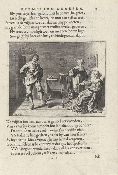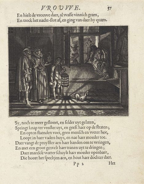 Curator: This 17th-century print, "Actaeon en Jolinde," by Daniël van den Bremden is held at the Rijksmuseum, an etching combined with engraving techniques. The print depicts an interior scene, seemingly a narrative moment unfolding. Editor: Yes, that's right! At first glance, the scene feels intimate yet crowded. There’s a sense of contrasting social classes happening in the room as the left side depicts a more humble setting than the two elegantly dressed figures on the right. How would you interpret the dynamics happening between them? Curator: Considering the social context of the Dutch Golden Age, we see class structures visibly reinforced through fashion, posture and staging. It feels like an uneasy intersection between the lives of those seemingly well off and those who depend on social gatherings at the table to subsist. Editor: I see that. Can you elaborate more on the narrative or symbolic weight within that space? Curator: I’d point you toward thinking about what role prints like these had in constructing and perpetuating class ideals, even romanticizing some problematic economic disparities. What kind of behaviors are being modeled or implicitly critiqued in scenes like these, what moral lesson could one derive from the artist’s construction of "Actaeon en Jolinde?” Editor: So you’re suggesting that these works weren't just pretty pictures, but tools used for defining acceptable social and economic behaviour at the time? It shows a reality, and gives commentary on that reality to promote behaviour, whether intentionally or unintentionally. Curator: Exactly. By examining the subjects displayed in tandem with the socio-economic and cultural conditions of the era, prints like these really speak to how notions of class, gender, and power circulated. I hope looking through that intersectional lens helps you and the other museum goers better understand not just the subject in the work but the why, and perhaps the what now of what remains. Editor: I didn't think of it in those terms, and it offers such a great angle into other historical paintings.