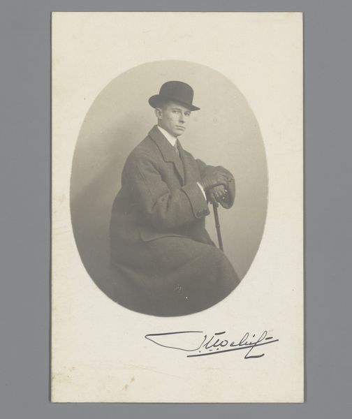 Curator: This photograph is titled "Portret van een man met bolhoed," or "Portrait of a Man with a Bowler Hat." It’s a vintage gelatin silver print attributed to Peter Clausing, placing its creation somewhere between 1891 and 1920. Editor: Immediately, I'm struck by how utterly ordinary he looks, yet there’s something quietly defiant in his gaze. I feel a somberness here. Like, "Leave me to my own devices, world." You know? Curator: The bowler hat itself is a key symbol. It represents the rise of the middle class and their aspirations in the late 19th and early 20th centuries. A kind of uniform for urban respectability. Editor: Right, the bowler – it’s trying so hard! But it can’t quite conceal… I don't know…a melancholic disposition. The way he poses, the angle of his arm, it feels self-contained, as if he is constructing a world of his own where rules and meaning don't quite mirror those of the world that contains him. Or maybe I'm just projecting. Curator: I see that you are sensitive to these symbols too, since that ring on his hand could suggest hidden allegiances or affiliations—a fraternal order or secret society, even. Such pieces often held significant meaning within specific subcultures. Editor: A secret society, you say? That sparks my imagination! It feeds into my feelings when I first looked at the photo: A silent film villain meets dapper everyman. Also the material texture seems heavy, literally weighted down. This really comes through. Curator: I think your perception is interesting. Photography in this era often tried to emulate painting, particularly in formal portraits. Notice the carefully controlled lighting and composition. This pursuit of artistry speaks volumes. Editor: Art imitating life, imitating art—it's the old story! What remains palpable through the emulsion is the weight and presence of history in this quiet man. His somber posture tells us volumes about being caught up in the gears of modern life. Curator: Exactly! He mirrors the rise of modernity. From that perspective the work's commitment to Realism mirrors this commitment, Editor: For me, he stands as a solitary observer caught in time, offering a window into his soul. He reminds us that photographs document moments—but they are open to limitless narratives. Curator: Indeed. The quiet dignity emanating from this piece lingers, provoking contemplation beyond its subject, offering pathways to different levels of knowledge.