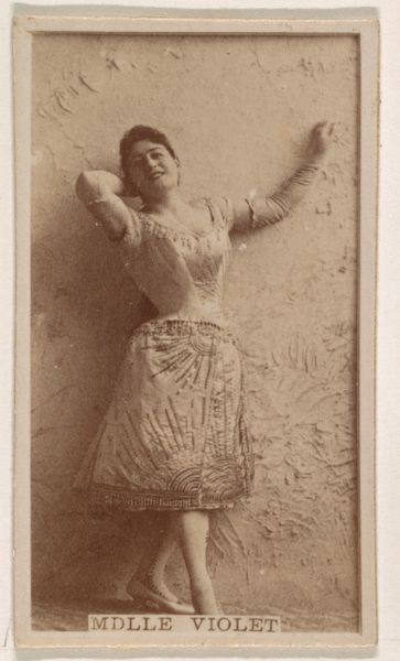 This is a promotional card of Mabel Clark from the Actors and Actresses series, created by Allen & Ginter for Virginia Brights Cigarettes. The sepia tone gives the card a nostalgic feel. Mabel Clark's body forms dynamic lines as she balances on one foot. Note how her lifted leg and arm create a sweeping diagonal that bisects the composition, drawing the eye upward. Her dress adds texture, with layers of ruffled fabric that soften her pose. The composition creates a contrast between her movement and the static backdrop, which includes a classical relief. This juxtaposition might reflect the tension between classical ideals of beauty and the modern, dynamic energy of the performing arts. The card can be seen as an early form of celebrity endorsement, using Clark's image to promote a lifestyle associated with sophistication. It also underscores the construction of fame and the commercialization of image in popular culture. The card's design prompts us to reconsider the interplay between art, commerce, and the representation of identity.