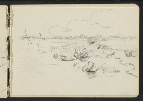 Curator: Looking at this ink and pencil drawing titled "Landschap", made in 1923 by Alexander Shilling, I’m immediately drawn to its unassuming simplicity. Editor: There’s a melancholic feel to it, don't you think? The stark lines, the muted tones. It’s almost… haunting in its quietness. Curator: Indeed. Shilling was working during a time of tremendous social upheaval. There’s a rawness, perhaps born from witnessing dramatic political events, channeled here through the mundane scenery. Think about how new artistic collectives were forming at the time, often built around revolutionary social agendas. Shilling was part of a broader redefinition of public imagery. Editor: The landscape, with its sparse details and almost primitive lines, conveys a deeper symbolic message. Notice the dilapidated structure; perhaps it's a dock or a pier, almost swallowed by the surrounding land. Is this symbolizing the fading vestiges of a prior era being subsumed by the present? I am struck by its potential to mirror society's transitional phases, always marked by decline, change and impermanence. Curator: That pier does suggest obsolescence, doesn’t it? And look at the strokes – the way he renders the foliage. It's loose, almost chaotic, yet undeniably captures the essence of nature. Editor: Yet consider the perspective, Curator: seemingly straightforward, a casual moment captured in ink and pencil. Is this artist’s intention? Should it prompt introspection on what “lies” between the lines or just depict our surroundings devoid of any symbolism? Curator: Well, its value also resides in capturing the zeitgeist of artistic expression during a very particular historical period. The artist’s choice of landscape is perhaps both universal, as subject, yet equally influenced by contemporary tastes of portraying something less idealistic. It asks us about the social construction of art. Editor: You are correct, of course. Its strength is certainly found at those complex intersections. It’s that tension, I think, that will continue to engage viewers for years to come. Curator: Agreed. There’s certainly more than meets the eye here.