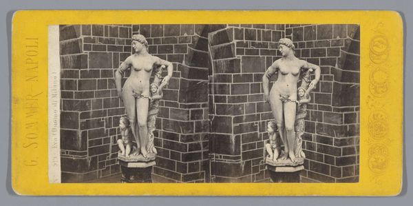 Curator: It looks like we're gazing upon an old soul wrestling with a particularly bothersome splinter. Is that the impression you get? Editor: Indeed. This stereoscopic photograph captures a sculpture of the Spinario within the Grand Trianon's vestibule. Dating roughly to the period between 1860 and 1880, it is a reproduction of an older roman work. It prompts interesting questions of value and appropriation through display and reproduction, don’t you think? Curator: Totally! But for me it's the intimate moment the sculpture suggests—a kid lost in his own little drama, magnified a million times by this grand setting. All those echoing halls for a splinter! What material could the sculpture be, though? Editor: Given its placement in the Grand Trianon, marble would seem likely for a full-scale permanent replica displayed there. Curator: Ah, classic! Although from this distance, one might not catch the finer textures, that smooth cool surface is calling to me, which this photographer has expertly rendered. There's an odd comfort in such old stories re-told, reframed... This work definitely reflects classical and mythological themes! Editor: Precisely, but its accessibility depended greatly on the institutional frameworks that disseminated images to wider publics; stereocards were highly sought by eager enthusiasts, for example. That access informed not just their tastes but understanding of culture. How these historical images became available is no accident and deeply related to issues of access and social hierarchy! Curator: Makes me ponder who else had access to grand properties and grand art like this? Who *didn't* get to share this vision? A photo like this definitely brings that conversation to life, or better, light. I'll remember this photo next time my toddler whines about his sticker situation. Editor: I will keep in mind how easily photography transformed our understanding of display and cultural dissemination across different media.