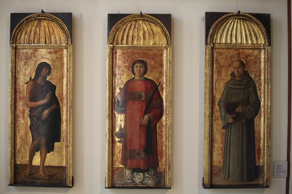 Antoniazzo Romano painted these three saints – Vincent, Catherine of Alexandria, and Anthony of Padua – in the late 15th or early 16th century, probably in Rome, where he was based. The presence of saints like these tells us something about the social function of art at this time. A painting was an aid to devotion and these saints were believed to intercede on behalf of the believer. Notice how each saint holds attributes which allow for immediate identification: Catherine, in the centre, holds a palm frond indicating her martyrdom, and a spiked wheel, the instrument of her torture. Although it may seem formulaic to us now, this kind of painting played a vital role in society then, reinforcing religious belief and offering reassurance in an uncertain world. To understand this function properly, the art historian consults devotional literature and considers the place of the painting within the religious institutions of the time. Only then can we appreciate its importance.