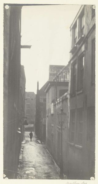 Editor: Here we have Thomas Annan's gelatin-silver print, "Laigh Kirk Close," created in 1868. The deep shadows and the stark, narrow passage create this almost claustrophobic feeling, like stepping back in time. What resonates with you when you look at this work? Curator: It's the weight of history, isn't it? The stones whisper stories of centuries. For me, it's like peering into a secret world, a sliver of old Glasgow resisting the march of modernity. The geometric composition, almost brutal in its angles, guides your eye down that tunnel of time, daring you to enter. Do you feel drawn in, despite the darkness? Editor: Absolutely, there’s a strange pull. The woman standing in the middle distance – is she just passing by, or does she symbolize something more? Curator: Ah, the figure! Perhaps she is a ghost of Glasgow's past, forever caught between the stones. Annan wasn't just documenting; he was capturing the soul of a vanishing world. Notice how the light, so limited, picks out those details - a fragile human presence against the immovability of stone. Does that tension speak to you? Editor: It does, definitely. It makes me wonder about the lives lived within those walls, the contrast between their fleeting existence and the city's enduring presence. I didn't expect a cityscape to feel so... personal. Curator: Exactly! Annan invites us to become urban explorers, to get lost in the forgotten corners of our cities, and perhaps, to find a little piece of ourselves reflected in their shadows. It’s a powerful reminder that history isn’t just something we read about – it's a living, breathing presence all around us.