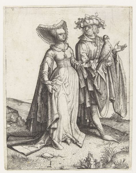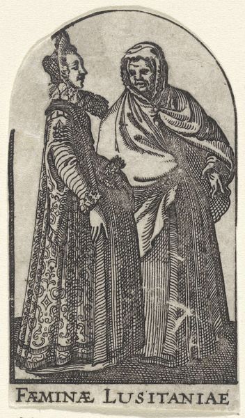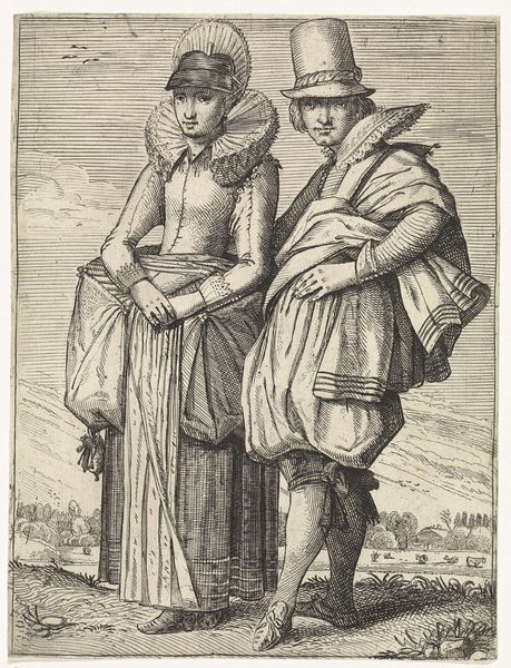 Curator: The Rijksmuseum holds this engraving by Crispijn van de Passe the Younger, titled “June: A Couple from Spain,” dating from the early to mid-17th century. What strikes you initially about this depiction? Editor: It’s the ruffs! Those enormous lace collars practically encircle their heads like halos or maybe even millstones. They're such an overt symbol of status and yet, seem utterly impractical, like beautiful cages. Curator: The ruffs are indeed notable, setting a particular tone that communicates elite identity. This print is part of a series representing different nationalities by showcasing their distinctive dress. Here, Spanish fashion is put on display. How might prints like these function within a broader European context? Editor: In a period defined by burgeoning global trade and colonization, these prints create and perpetuate a visual taxonomy of people. It feels akin to a form of early ethnographic cataloging, simultaneously exoticizing and, perhaps, subtly reinforcing existing European power structures. Who gets to observe, to categorize, to visually “own” these images of others? Curator: Precisely. The act of observing and documenting was undeniably tied to colonial ambitions and emerging national identities. Also note the inscription; text was critical for interpreting the images and disseminating knowledge, albeit knowledge often shaped by cultural biases. How do you read this pairing? The way they’re posed, their expressions… Editor: I see a studied formality. Their almost hesitant touch conveys a social dance of sorts. It speaks to arranged marriages and the weight of familial or dynastic expectation. Also, I'm thinking about visibility – or rather, *in*visibility. Who is truly represented? This feels more like performance, class performance especially, than anything intimate or revealing of true lived experience. Curator: That's a powerful observation. It pushes us to question the authenticity of these types of depictions, to see them as constructed representations intended to communicate certain messages about status and culture. Editor: Looking closely has made me question how this image both reveals and conceals. How easy it is to fall into the trap of exoticism without thinking about whose perspective dominates the visual narrative. Curator: I think that is a crucial insight, and I appreciate that focus when considering artworks meant to convey cultural specifics.