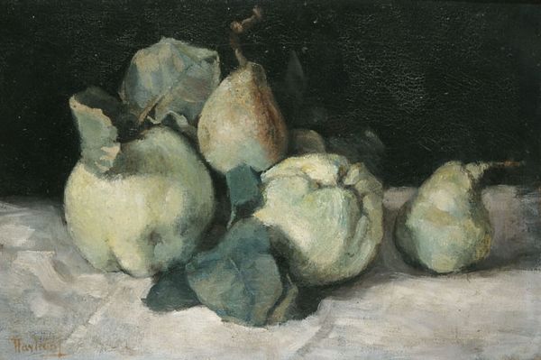 Editor: Patrick Henry Bruce's "Plums," painted in 1912 using oil, presents a deceptively simple scene. The application of the paint appears quite thick and creates noticeable texture on the canvas. How does the artist's specific treatment of form and color impact the overall composition here? Curator: Notice the deliberate arrangement. Bruce reduces the plums and drapery to fundamental shapes. He doesn't aim to perfectly replicate observed reality. Consider how the limited palette—predominantly variations of green, yellow and muted browns and lavenders—serves to flatten the picture plane, denying deep recession into space. Are the plums grounded in reality, or floating in an arrangement? Editor: It’s almost as if he is playing with shapes and colors. Does the simplification enhance the aesthetic value of the work, or does it detract from it? Curator: Formally, the brushstrokes are not blended smoothly. Bruce constructs each plane with discrete touches of pigment. Consider the way he builds highlights and shadows using visible strokes, emphasizing the materiality of the oil paint itself. Does that method encourage or hinder interpretation of space and distance? Editor: It’s fascinating how much analysis can be derived from just looking at shape, texture and color, without focusing on symbolism or the artist's life. Curator: Precisely. Formalism redirects us to attend closely to the object, the thingness of the art. The reward is understanding a completely non-referential approach. Editor: I am looking at the work through fresh eyes now! I was focused on subject, but can see how it really emphasizes line, shape and color over the creation of illusionistic space.