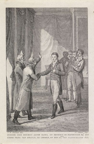 Jean-Louis Van Hemelryck created "De fanatiekelingen," which translates to "The Fanatics," in 1828 using etching. This work emerges in the aftermath of the Napoleonic era, a time of political restoration and social realignment in Europe. Van Hemelryck offers us a satirical view of military life, playing with themes of authority, obedience, and the absurdities of regimented behavior. The central figure, likely an officer, stands rigidly, while his subordinates display varying degrees of disinterest. The artist uses caricature to emphasize class distinctions and poke fun at the hierarchical structures of military society. The etching style enhances the satirical tone, using exaggerated expressions and postures to convey a sense of mockery. The artist is inviting us to consider how power dynamics function. Are we looking at blind obedience, the critique of power structures, or the experience of those subjected to authority? There is an emotional undercurrent to the piece as well. It hints at the alienation and dehumanization that can occur within systems of rigid control.
