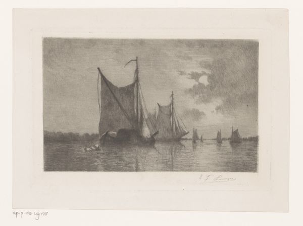 Curator: Ah, the salty air practically jumps off this print! There's something wonderfully somber about it, don't you think? Almost melancholic. Editor: It’s Gustave Joseph Biot’s “Zeilschepen van de Geuzen,” dating from 1843 to 1905, currently held in the Rijksmuseum collection. This print utilizes etching to bring a sense of quiet drama. The fleet almost emerges from the mist itself. Curator: It’s an odd calm for what I imagine were quite turbulent times. I love how the light sort of dissolves everything. It could be a dream, a memory… were those boats carrying rebels, revolutionaries perhaps? It’s hard to tell. They almost look spectral. Editor: Indeed. The title translates roughly to "Sailing Ships of the Geuzen," referencing the "Sea Beggars" or "Gueux de mer," the Dutch rebels during the Eighty Years' War fighting for independence from Spain. It reflects the 19th-century Dutch interest in reclaiming national heroes from their past and constructing an image of national pride in resistance. That would account for that air of sombre heroism that you've captured. Curator: So not just a landscape, but a loaded image, pregnant with patriotic yearning! Knowing that it takes on a new depth. It isn’t just mist we’re seeing, but history, the mists of time… So dramatic! Editor: Precisely. And this image being a print allowed for wider dissemination and engagement, embedding Biot’s representation further into the culture and historical consciousness of the era. The print medium here facilitated popular interpretation of history. Curator: Fascinating how a print, something almost seemingly insignificant, can carry such powerful, lingering emotions. I initially responded to that overall melancholy in the landscape, which still resonates; now knowing its deeper historic context I feel something else, an echo from history... almost ghostly! Editor: Exactly, that’s why art from every era matters! Biot's technical ability merged with historical narrative helped shape national identity. Understanding art through this political history provides us insight into Dutch society and culture, as well as ways of image-making, for that moment in time.