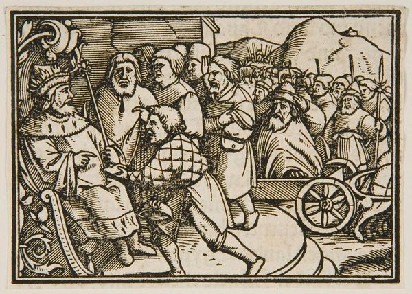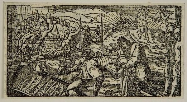 Curator: This intriguing, unattributed woodcut is called "Genesis 9: Drunkenness of Noah" and comes to us from the Harvard Art Museums. Editor: It looks like a chaotic scene, with a vulnerable figure at the center, but there's a strange formal quality to the rendering of the figures. Curator: Right, it depicts a biblical narrative loaded with cultural significance, specifically the moment Noah's son Ham sees him naked and intoxicated, and tells his brothers about it, raising questions about power, shame, and respect. Editor: The stark contrast created through the woodcut process lends itself so well to the depiction of the narrative, and focuses on the labor and the making of the image. Curator: Exactly, and thinking about the social context in which the image was created also allows us to explore issues of race and otherness, themes that are still very relevant today. Editor: Considering its materiality and process, the image offers a potent glimpse into art production, and allows for questions about the value and labor involved in its creation. Curator: Absolutely. And in that way, "Genesis 9" really invites us to consider the complex social and political dimensions of image-making. Editor: A powerful piece! It underscores how essential an artwork's materials are to communicating its meaning and cultural importance.