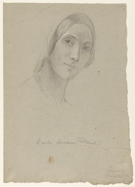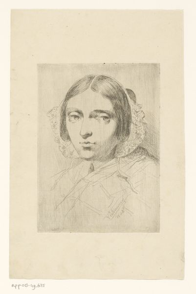 Curator: Immediately striking, isn't it? There’s a vulnerability to the piece, a fragility in the very pencil strokes. Editor: Indeed. What are we looking at? Curator: This drawing, titled "Hoofd van een vrouw" – “Head of a Woman” – was created by Guillaume Joseph Vertommen, around 1841-1842. It's currently housed right here at the Rijksmuseum. Vertommen utilized pencil, a medium readily accessible, to create this portrait. Think about that directness. Pencil to paper. What story can we unlock about material use? Editor: It is deceptively simple in its construction. The subject's gaze is unsettling – or perhaps invites reflection. How does this depiction interact with the prevailing gendered portrayals within art of that era? Was it subversive to display such rawness of emotion, the slight dishevelment of the lace? I wonder what kind of politics play a part here? Curator: The roughness actually intrigues me; how the artist has not opted for a perfect finish—but we must also consider that portraiture in that era was being revolutionized by the rise of photography, and its unique ability to freeze a specific image in time. Vertommen worked around the problem using materials and working in an economical way; for instance, look at how he captures light with minimal hatching. It allows a play between light and dark; an immediate sense of depth. Editor: The unidealized representation feels conscious, almost defiant when contextualized alongside mainstream portrayals which enforced restrictive feminine identities. Could this piece function as a visual assertion of individuality beyond prescribed social constraints? How do viewers then and now interpret agency here within societal power imbalances that inform perceptions around female subjecthood and visibility? Curator: Precisely! It becomes fascinating if one speculates about whether or not she was able to consent to it, what type of payment was given. When we explore beyond the physical qualities we realize there is so much labor behind artworks and how labor can shape representation! Editor: Yes, you make such compelling connections, especially by contextualizing art's power. I now notice aspects previously unnoticed, like, where I'd seen meekness, I now detect resolute courage in these barely-there pencil marks. Curator: It’s in exploring this interweaving of materials, technique and socio-economic conditions which truly lets a drawing sing! Editor: Exactly.