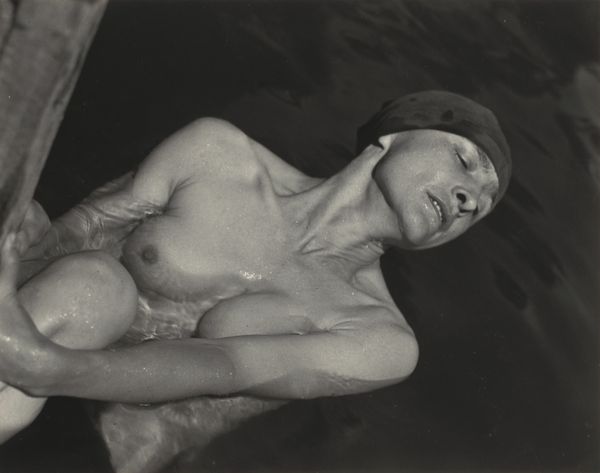 Editor: This gelatin-silver print, “Rebecca Salsbury Strand” captured in 1922 by Alfred Stieglitz, strikes me with its almost joyful serenity. She reclines, partially submerged in water, her smile seeming genuinely free. What is your interpretation of this work? Curator: That 'joyful serenity' grabs me too. I mean, look at the way the light dances on the water, blurring the lines of her form. Stieglitz wasn't just taking a picture, was he? He was evoking a feeling, a moment of pure, uninhibited… being. Do you feel that the stark contrast and the monochrome enhance this intimacy, almost as if stripping away distractions? Editor: Definitely. The black and white palette focuses my attention, as if whispering instead of shouting. I hadn’t considered the intent so deliberately, I mostly noted his composition style. Curator: The 'whispering', I love that. Because that’s what pictorialism did – tried to pull photography away from being purely documentary towards being art that evoked emotional response like paintings. A bit like music in stillness if you catch my drift. Consider, too, how Rebecca, the subject, was also an artist herself and Stieglitz's partner at the time. Does that layer more into our reception? Editor: That does change things! Knowing their relationship and Rebecca's own artistic sensibility… it adds another layer of understanding, or at least invitation. It isn't just a candid snapshot; it's a collaborative exchange of artistry, of gazes. Curator: Precisely! The photograph becomes this intimate dance. Like a conversation frozen in silver. Stieglitz captures more than just her image; he captures something about their bond, that era of modern art, a sliver of truth refracted through his particular artistic lens. Editor: I feel like I went from just seeing an artwork, to knowing its heart. It's all about the layers! Curator: Isn't it always? And that’s the best part, there's no absolute definition about what art is, but infinite angles on meaning.