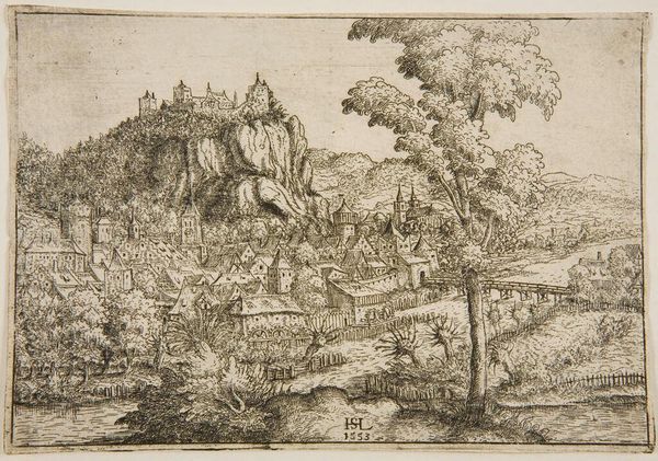 Editor: So, this is "Panoramic Mountainous Estuary Landscape, with Christ and the Woman of Canaan" by Lucas Gassel, dating from sometime between 1515 and 1575. It's an intaglio print. The detail is astonishing. I’m immediately drawn to the juxtaposition of the biblical scene in the foreground with the vast landscape, the daily life around it seeming almost indifferent. What strikes you most about this work? Curator: What resonates with me is precisely that tension you identify. Consider the power dynamics inherent in this landscape. The story of Christ and the Woman of Canaan, a narrative of faith tested and ultimately rewarded, unfolds within a specific social hierarchy. Gassel places this intimate moment of interaction between marginalized identity and religious authority against the backdrop of burgeoning cities and trade routes. Can we see the hints of colonial expansion beginning to shape European consciousness here, informing notions of self and other? Editor: That’s a really interesting point. The landscape feels so classically Northern Renaissance, almost idealized, and yet you’re suggesting it hints at a broader societal shift… Curator: Exactly. Consider who had access to such landscapes, both in reality and representation. Who controlled these burgeoning cities and trade? This image subtly reinforces those structures even as it depicts a story of supposed inclusion. Notice how Christ is positioned in relation to the crowd observing, to the woman… What statement might Gassel be making? Editor: I see. So it's not just a beautiful landscape with a biblical scene; it's an active commentary on the socio-political landscape of the time, reflecting the complex interplay of faith, power, and identity. The layers are quite powerful. Curator: Precisely. Art serves as a potent mirror, reflecting and refracting the very societies that create it. Looking closer often prompts deeper questioning about accepted narratives. Editor: I’ll definitely carry that with me. It changes how I understand art and its role in reflecting history.