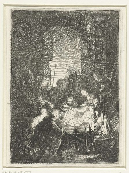 Editor: Here we have Rembrandt van Rijn's etching, Christ Driving the Money Changers from the Temple. It’s incredibly detailed for such a small print! The chaos feels so tangible. What stands out to you? Curator: The print medium itself is crucial. Etching allowed Rembrandt to disseminate this critique of material corruption widely. Note the contrast: the sacred space versus the labor of the money changers. How does Rembrandt’s choice of this medium comment on the commodification of religion? Editor: So, the printmaking process emphasizes the tension between the spiritual and the material? It is food for thought! Curator: Precisely! Considering the means of production deepens our understanding. Editor: I’ll definitely look at prints differently from now on!