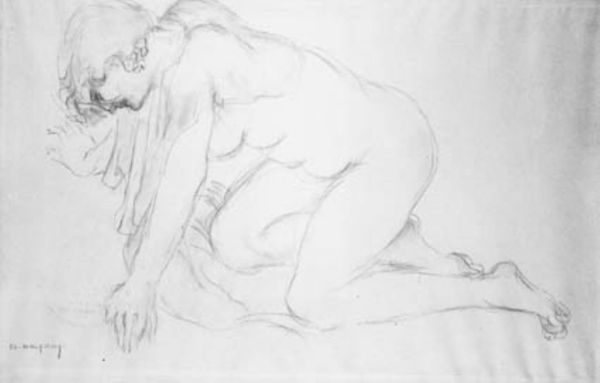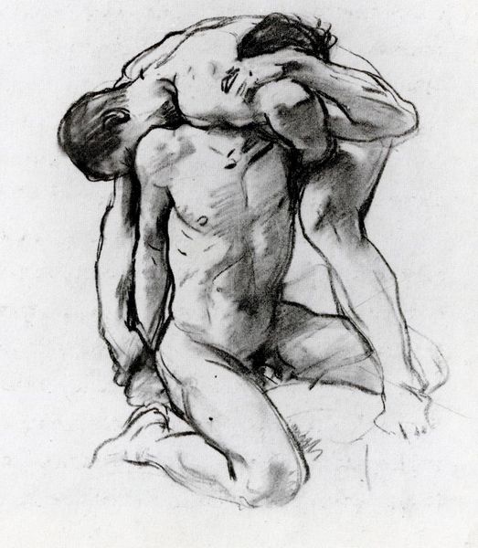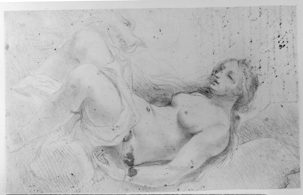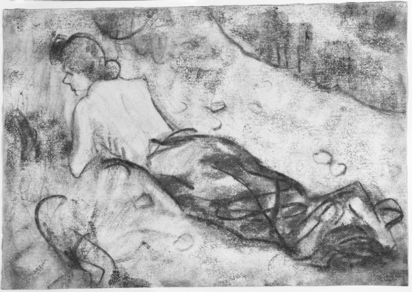 Curator: This is František Kupka’s charcoal drawing, "Study for 'Planes by Colors, Large Nude'," currently residing here at the Harvard Art Museums. Editor: What a mood! It feels like a melancholic dream, the woman is lost in thought. Curator: Kupka was intensely interested in how art could reflect inner states, and this study offers insight into his exploration of the nude form as a vehicle for emotional expression. The work asks us to consider the historical legacy of objectification within the art world. Editor: There’s a vulnerability, sure, but also a strength in her pose. It's like she owns the space she's in, even in her contemplation. It makes you wonder what she's thinking. Curator: Absolutely. And considering Kupka's later shift towards abstraction, this piece hints at a move away from traditional representation. The nude becomes a framework for exploring the interplay of light and shadow. Editor: It's got me wondering about my own relationship with vulnerability. It’s a powerful and quiet piece.