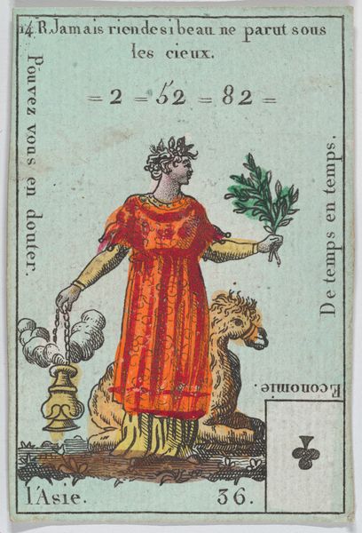 Curator: This artwork is called "Allegory of Europe, from playing cards 'Jeu d'Or,'" dating back to the 18th century, part of the Metropolitan Museum of Art’s collection. It appears to be an engraving, possibly with some hand-coloring. Editor: My initial impression is one of elaborate symbolism. There’s an almost dreamlike quality to the arrangement of figures and objects; it is so dense in signs. It evokes a sense of history being constructed, a deliberate layering of meanings. Curator: It's fascinating to consider the social context of playing cards like these. Beyond entertainment, they served as vehicles for disseminating knowledge and cultural values. The materiality of these cards is important—consider the paper quality, the printing techniques; this points to a certain level of craftsmanship and expense, implying a specific market of consumers. Editor: Yes, I’m drawn to the central figure, who is presumably the allegory of Europe herself. Note the crown, the scepter – obvious symbols of sovereignty. The cornucopia overflowing with fruit and the architectural structure she’s holding - what significance might these have held for the card’s original audience? Curator: Considering Europe's colonial expansion during this period, the horn of plenty could be interpreted as representing the resources extracted from colonized lands, transformed into a commodity for European consumption and pleasure. We must interrogate this further by asking questions of how materials, resources, or even laborers moved. Editor: That makes sense. The text surrounding the figure is interesting too. I see French phrases and numeric codes or riddles around the card. And there's the single heart shape indicating this might be from the suit of Hearts. Clearly this game was intended for sophisticated players! Curator: And this sophistication implies certain class relations. The card indexes not just cultural but economic information and ways of creating symbolic power to make sense of geopolitical circumstances. These cards point to ways in which consumption is an aesthetic and ideological project. Editor: Thinking about the long lives of symbols—a scepter still implies authority today. Perhaps tracing how objects or forms accrue, shed, or twist their associations can illuminate the ever-shifting yet continuous patterns within our cultures. Curator: Precisely, thinking about the way value gets materialized in certain objects over time lets us grasp art making not simply as representation, but as embedded within the material conditions and exchanges of social life. Editor: Looking closer has made me appreciate the image’s intentional, encoded visual vocabulary. Curator: And by understanding its production we reveal the mechanisms through which playing cards played a social and economic role during the enlightenment period.