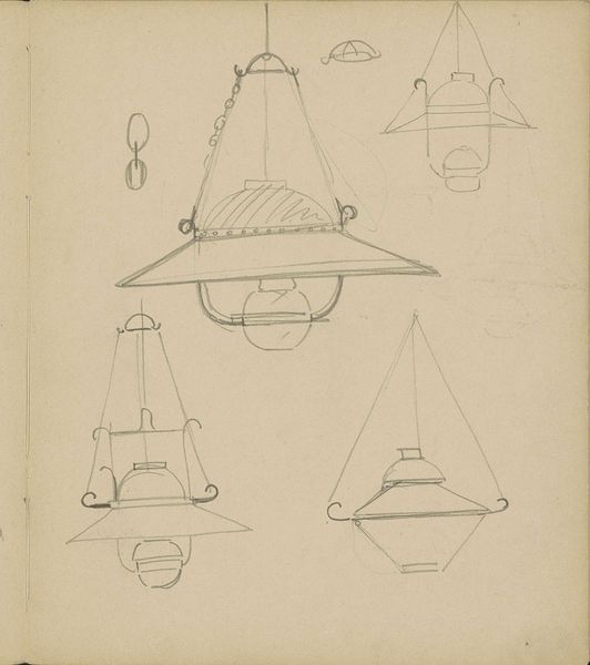 Curator: This lovely drawing, “Ontwerpen voor hanglampen,” or "Designs for Hanging Lamps" as we’d say in English, comes to us from Carel Adolph Lion Cachet. It's a pencil on paper piece dating from around 1905-1906. What’s your immediate reaction to it? Editor: It feels like stumbling across a secret inventor's notebook. It’s more playful than polished. You can almost hear the gears turning in Cachet’s mind, can't you? I imagine that this aged paper would have held numerous preliminary ideas. Curator: Precisely! The light pencil work definitely lends itself to the sense of free exploration, as well as highlighting its place in a larger Art Nouveau sensibility. Cachet, known for his decorative arts contributions, presents us with something beyond mere utility. Editor: Yes! Those initialed designs! It's as if the light itself needed a monogram, like high-end luminous stationery. But thinking about it from the angle of interior spaces and architecture from around 1905, does this sort of sketch stand out from what others were doing at the time? Curator: Absolutely, it offers an insightful reflection into the broader historical context of interior design. There's a conscious shift from pure ornamentation to integrating form and function during the Art Nouveau movement. Symbols gain importance – not merely aesthetic but hinting at deeper meanings like light, warmth, and domesticity. Editor: It's interesting how he doesn't seem stuck on one particular aesthetic, does he? Like, some are more geometric and linear, while others play with those swirling organic motifs of Art Nouveau. Each feels like a different possibility for illumination. Almost literally lighting up a new idea each time. Curator: Indeed, they reflect that transitional era where craftsmanship met budding industrial possibilities. These sketches preserve a moment of imaginative potential. They echo sentiments and expectations related to progress. Editor: Well, seeing these quirky sketches laid out like this makes me think of a hopeful gaze toward the future, too. A future full of personalized lighting! That sketchbook feel is great, don't you think? Curator: A great find to appreciate and reflect on those creative origins, definitely. Thank you for sharing your insights! Editor: Likewise, for revealing all that hidden beauty.