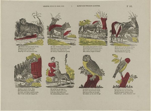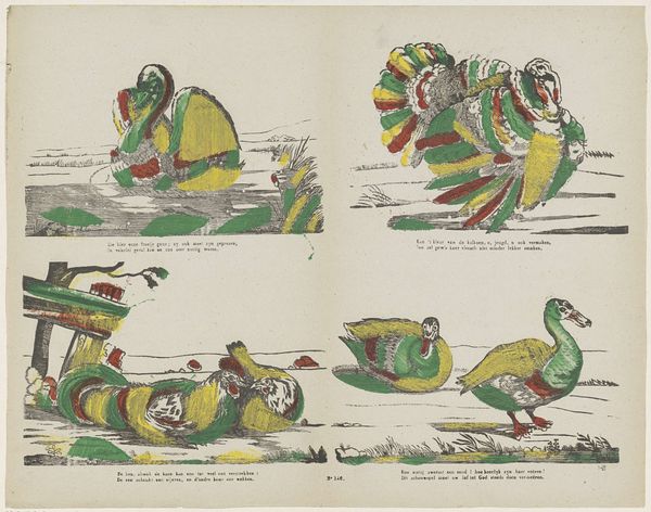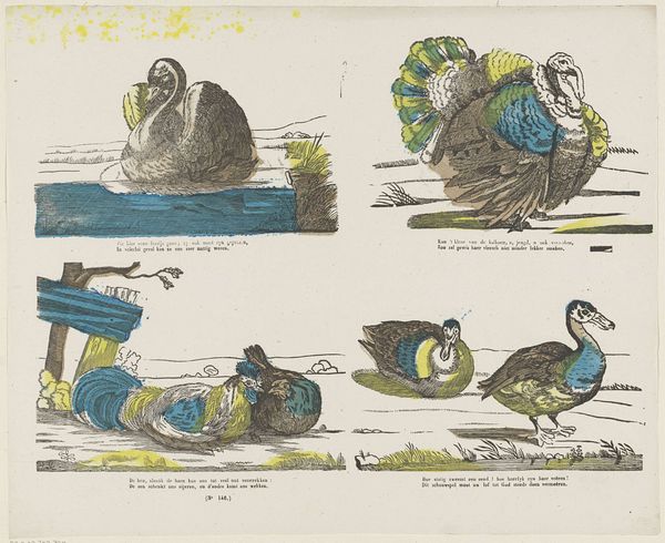 This print of fowl, *Pluimvee*, was created by Glenisson & Van Genechten using line engraving and chromolithography. These processes require the artist to plan the composition in layers, one for each color. The crispness of the engraved lines contrasts with the flat areas of color added later, influencing the appearance of the artwork. The method of chromolithography required the manual application of colors to a stone matrix, then transferred to paper using a press. This division of labor is typical of industrialized printmaking in the 19th century. The artist creates the initial design, but the actual printing would have been done by teams of skilled workers. The finished print thus embodies a tension: the naturalistic subject matter rendered with the precise, repeatable technology of industrialized image production. By understanding the means of production, we gain a deeper appreciation of the cultural context and the artist's role in this process.
