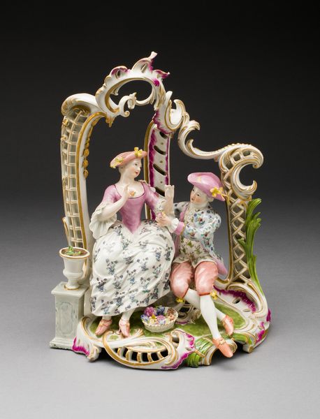 Curator: Let’s consider this captivating porcelain sculpture titled "The Handkiss," crafted around 1737 by the Meissen Manufactory. You can find this treasure here at The Met. Editor: Immediately, what strikes me is the dynamic arrangement of the figures—it's almost Baroque in its swirling energy, yet refined through the delicate Rococo sensibilities. The rich interplay of colors and textures… incredible. Curator: Indeed! The group presents a genre scene reflecting aristocratic social life. Consider the role of Meissen porcelain in the 18th century—it symbolized wealth, taste, and power, serving as diplomatic gifts or decorative objects in elite circles. Editor: Precisely! The miniature scene bursts with meticulous detail. Look at the intricate floral designs on the woman's skirt or the glints of gold tracing every edge. It almost transcends functionality, wouldn't you say? Curator: Undoubtedly, porcelain transcended functionality! What is particularly relevant is that representations like these reflect a social order—where you have a queenly figure seated on a throne, a kneeling admirer performing an act of deference, and the ever-present, enslaved servant off to the side, implicitly showing the hierarchy of labor. Editor: The figures exhibit stylized forms, certainly—notice the graceful S-curve in the woman's posture and the carefully sculpted drapery around the hand-kissing admirer. What is your assessment of this visual organization and what it communicates in and of itself? Curator: I read those aesthetic features not just as Rococo beauty, but also as evidence of carefully crafted aristocratic presentation for their elite audience. Each of the details, the poses, and the choice of subject contributes to the symbolic representation of their place in society and the display of their values and authority. Editor: It's a potent blend, really—the delicacy of the material playing against the powerful dynamics and societal tensions depicted in the scene. I find it both intriguing and somewhat unsettling, given its ornamental nature and the deep societal imbalances present in Europe at the time. Curator: That tension is exactly what makes it a key art object to study and place within the historical context of artistic, political and socio-economic realities. Editor: I concur. Thinking of it from this more comprehensive angle gives another layer of profundity to what might first be read as simply decorative.