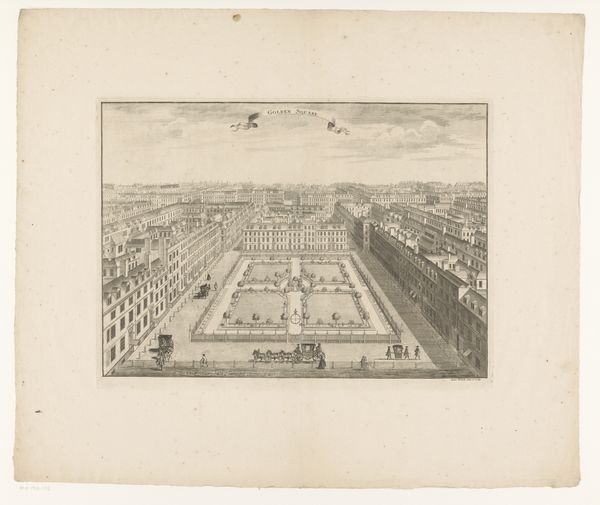 Curator: The level of detail is impressive, even from afar. The whole scene gives a sense of ordered grandeur, but also...distance. Editor: That's an apt description, and a feeling I think is quite intended. What we're looking at is "Gezicht op Hanover Square" by Sutton Nicholls, created sometime between 1720 and 1731. It’s currently held in the Rijksmuseum and is rendered as a print, through etching and engraving on paper with ink. It portrays Hanover Square, a fashionable London locale of the early 18th century. Curator: The aerial perspective really enforces this controlled sense of space, doesn't it? The square is neatly contained, almost like a stage set. What can you tell me about this urban development from a social history perspective? Editor: Hanover Square represented a conscious effort to shape not only the physical but also the social landscape. Developed by Richard Lumley, Earl of Scarbrough, it was intended to attract the aristocracy and gentry, subtly reinforcing class structures and spatial hierarchies. The architecture itself speaks to this. Notice the uniform facades – a visual expression of wealth and status, intended to project an image of uniformity and order. But if we look closer at, say, gender within this context, who truly had the space to occupy here? Curator: That's a compelling point. We're seeing this manicured space as seemingly available, when in reality access and participation would have been very heavily policed based on status, gender, even clothing! These spaces implicitly reinforced exclusion and marginalization, a stark reminder of power dynamics operating through the built environment. Editor: Precisely. While the print offers a picturesque view, it's crucial to read it against the grain. Who commissioned this piece? What purpose did it serve? Whose narrative is amplified, and whose is erased? Thinking of contemporary theories of urban planning, it’s interesting how some patterns persist in today’s cities, where access is dictated not by nobility but other economic determinants. Curator: Absolutely. The seemingly objective image reveals its underlying ideologies under scrutiny. This examination deepens the interaction with art, questioning assumptions. Editor: It makes you wonder about the unspoken rules embedded within architectural and societal structures. Hopefully viewers will go home seeing the world with new analytical frameworks.