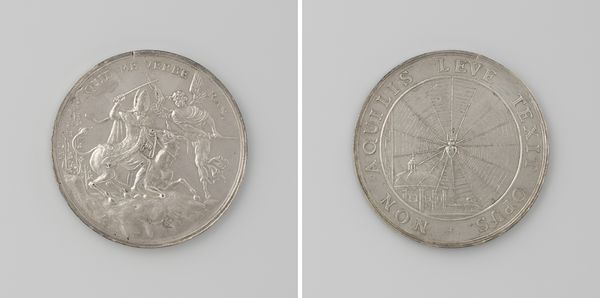 This silver coin, "Success in the Struggle Against Spain," was designed by Gerard van Bylaer around 1578. Notice its circular form; this shape is not just a practical choice for currency but also a symbolic one, evoking notions of wholeness and continuity. One side presents a standing figure, perhaps a representation of freedom, balanced by a seated figure opposite, creating a composition that invites contemplation. The lion on the other side is a powerful symbol, rendered with a degree of naturalism that belies its symbolic weight. The inscriptions that frame the images are not mere labels but integral components, directing our gaze and prompting us to decode the coin’s message. These visual and textual elements function as signs within a complex semiotic system, reflecting the political and cultural tensions of the time. Coins like this serve not only as currency but as enduring symbols of power, identity, and resistance.