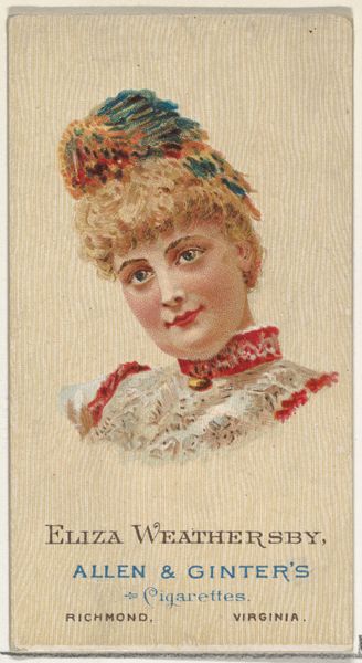 This small card, picturing Lillian Elmore, was made by Allen and Ginter Cigarettes, as part of a series featuring ‘World’s Beauties.’ It’s a lithograph, which is a printmaking process using a flat stone or metal plate. The image is carefully designed to appeal to consumers. Lillian is depicted with a refined elegance; the details of her hair, jewelry, and lace collar showcase high societal status. The print quality itself speaks to industrial advancement of the time. But let's consider the wider context. Cigarette cards were cheap to produce and included in cigarette packs as a marketing strategy. They were essentially a collectible incentive to promote sales. This connects the artwork directly to the rise of consumer culture, and reminds us that even images of beauty were, and are, commodities. By acknowledging the materials, making, and purpose of this card, we gain insight into the connections between art, industry, and society. It challenges the idea of ‘art for art’s sake,’ and encourages us to reflect on art’s role in a world of mass production and consumption.
