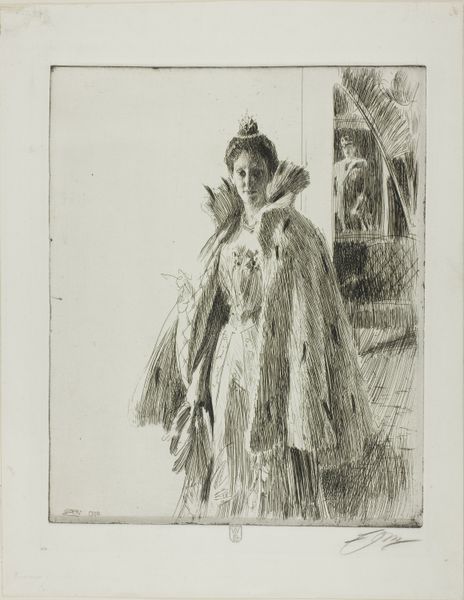 Editor: So this is Félix Bracquemond’s "Woman with a Fan," from around 1886. It's an etching, isn't it? There's something both intimate and distant about her gaze. What jumps out at you? Curator: The fan itself is almost a mask, a cultural artifact imbued with layered meanings. Fans, historically, weren't simply cooling devices; they were tools of flirtation, status symbols, and even encoded forms of communication in certain social circles. Doesn't the way she holds it seem almost… protective? What unspoken stories might it be concealing? Editor: Protective, definitely, I see that. Almost like it’s another layer of her dress. Could the fan maybe represent a barrier against the viewer? Curator: Precisely. Think of the female portrait throughout art history. How often are women displayed as passive objects of the male gaze? Here, the fan disrupts that dynamic. Bracquemond subtly grants her agency. Her eyes meet ours directly, yet the fan creates a sense of guardedness, of interiority. It becomes a potent symbol of female self-possession. What does her dress mean in that context? Editor: That's a new perspective for me! It never occurred to me how much power was held in these objects. About her dress – it’s patterned and flowing and makes her harder to look at directly. Her agency… does that relate to Impressionism and women artists in that period? Curator: It does. Artists like Berthe Morisot and Mary Cassatt challenged conventional depictions of women. But even male artists working within the Impressionist milieu, like Bracquemond here, began to explore more nuanced portrayals. The rise of Japonisme, with its emphasis on flattened perspective and decorative patterns, also influenced how artists conceived of portraying figures within a space. Editor: So, we're looking at more than just a pretty picture. There is symbolic complexity in everyday life. Curator: Exactly. Visual cues become like threads in a tapestry of cultural memory. We begin to appreciate art for its power to subtly encode so much human experience and cultural meaning into an image.