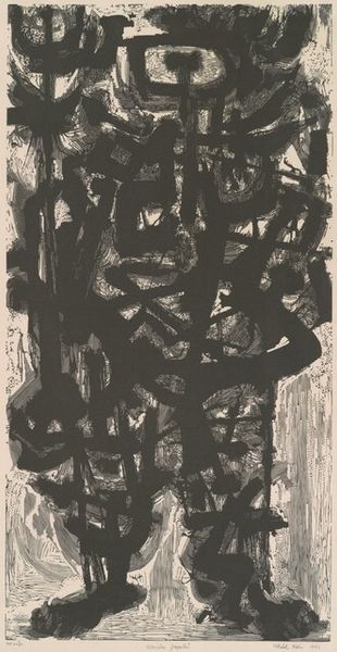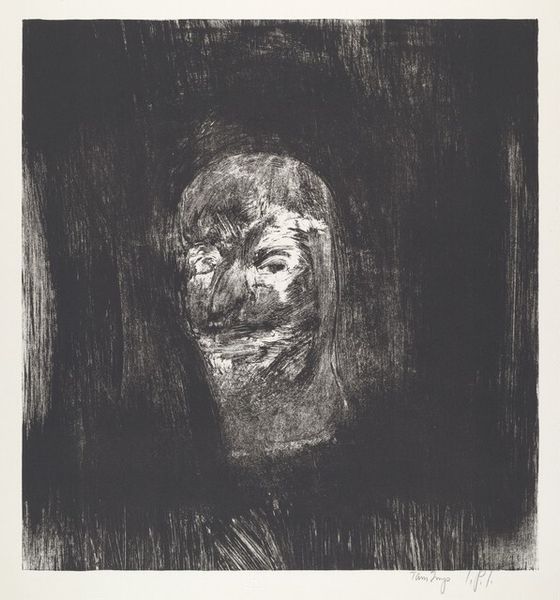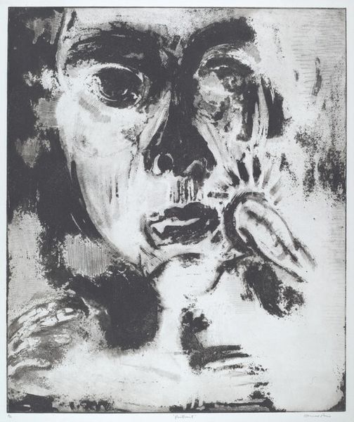 Curator: This is George McNeil's "Dionysus," created in 1973 using mixed media, including charcoal. Editor: Whew! That's... intense. It's like a grin stretched to the breaking point. A chaotic charcoal explosion, yet somehow resolved. Curator: McNeil was deeply involved with Abstract Expressionism, particularly its gestural qualities. This piece exemplifies how he translated those principles into figuration. His aim wasn't classical portraiture but a raw expression of energy. The god of wine, theater, ecstasy. Editor: It’s definitely ecstatic…or maybe terror-struck! That open mouth… Is it laughter or a scream? And the eyes! There's a real psychological charge to it. I keep thinking about McNeil's own context at the time. It came during a turbulent political era in the U.S. and it makes me consider this as a potent representation of inner chaos, reflecting a broader social unease. Curator: Exactly! You can see McNeil's understanding of the stage, in the almost performative distortion. The brushstrokes, thick with charcoal, feel almost sculptural, giving Dionysus a tangible presence. Consider McNeil's place within the broader art market. He never achieved the level of fame of some of his contemporaries, but pieces like this showcase a willingness to embrace dissonance. Editor: And what’s so great about his "Dionysus," and why I find myself responding to it, is how relevant and relatable that willingness to express the grotesque feels today. Even across the decades, "Dionysus" remains an interesting reminder that facing yourself, chaos and all, is how you find some peace, some understanding. Curator: I agree entirely. It’s a potent reminder that great art can reside outside of established popularity. Editor: Art with teeth, quite literally in this case!