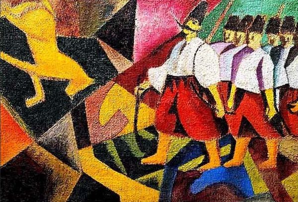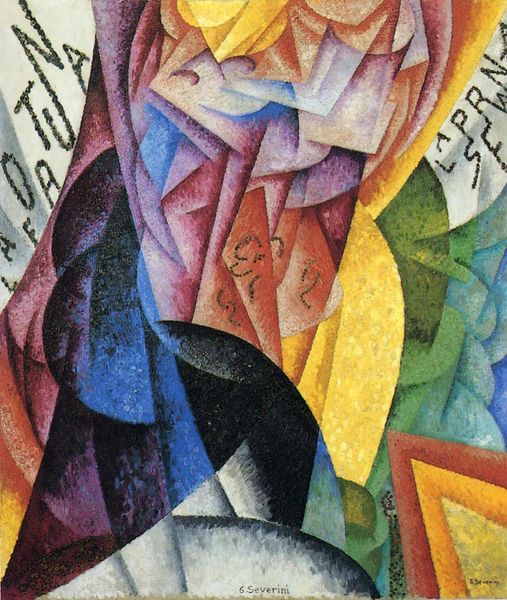 Curator: "Elasticity," an oil on canvas created in 1912 by Umberto Boccioni, a prominent figure in the Italian Futurist movement. It currently resides at the Palazzo Brera in Milan. Editor: Woah, I get a chaotic burst of energy from this. It's like trying to capture a feeling, or a sound, or a moment that's gone as soon as you look at it. Everything’s fracturing and reforming simultaneously, and I’m oddly drawn in. Curator: Absolutely. Boccioni and the Futurists were obsessed with portraying motion, speed, and dynamism in their art. Look at how he breaks down the subject into fragmented geometric forms and swirling lines. You sense the force and vitality; not just the depiction of movement, but an embodiment of it. Editor: The color palette is unexpectedly warm, isn't it? Lots of ochre, reds, and yellows that give it this sun-baked intensity. It's not just about raw power; there’s also an earthly, almost sensual quality that sneaks in through the back door. Is that deliberate, do you think? Curator: It is hard to interpret Boccioni´s intentionality for sure. We know the Futurists aimed to glorify modernity, celebrating technology, industry, and even war, which in their mindset brought acceleration. This “elasticity,” the capability of objects to change and deform when subjected to force, mirrors this radical embrace of modernity´s transformative potential. Notice the stylized form of the horse. It symbolizes raw animal power, and possibly war. Editor: Yes, I see it. But it doesn’t feel triumphant or violent to me so much as... caught up. Like everything is being reshaped, human, animal, nature, to conform to an inescapable forward momentum. There´s almost something plaintive about it. Is this force progressing us somewhere worthwhile or do we simply watch ourselves being torn apart. Curator: A provocative and worthwhile idea. It invites reflections of continuous transformation of cultural memory across time and through images that have a strong cultural and psychological impact. Editor: A powerful viewing experience to sit with; a fragmented vision that lingers as a vibrant presence.