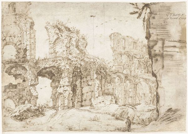 Editor: We’re looking at “The Collonade,” an etching by Thomas Wijck, dating sometime between 1616 and 1677. It's at the Met. I find this work evocative, presenting a world in ruins. The artist's use of line is impressive, so detailed yet gestural, don't you think? How do you interpret this piece, using just what we see? Curator: From a formal perspective, the intricate network of lines, rendered through the etching process, dictates the overall composition. Notice how Wijck masterfully uses hatching and cross-hatching to define depth and texture, primarily through line density and orientation. The interplay of light and shadow articulates the dilapidated architecture, creating a dialogue between form and decay. Editor: Yes, that use of light is key! It almost gives the structure another layer of, of erosion, almost. Do you think the choice of this medium contributes to that feeling? Curator: The very act of etching, with its inherent potential for fine detail and textured surfaces, augments the narrative of dilapidation. Consider, too, how the verticality of the columns interacts with the horizontal emphasis of the ruin mounds and horizon. It's a study in contrasts, visually enacting themes of permanence and impermanence. The texture in the groundscape, built only through line, feels barren. Do you notice how your eye bounces through the image because of it? Editor: I do, I jumped right from that barren land into the shadowed corner where that person is sitting. Thank you, I had not noticed all the nuance present. Curator: The genius here resides in Wijck’s manipulation of simple lines to conjure an evocative and thought-provoking piece. It speaks to the enduring power of formal qualities in imbuing an artwork with meaning.
