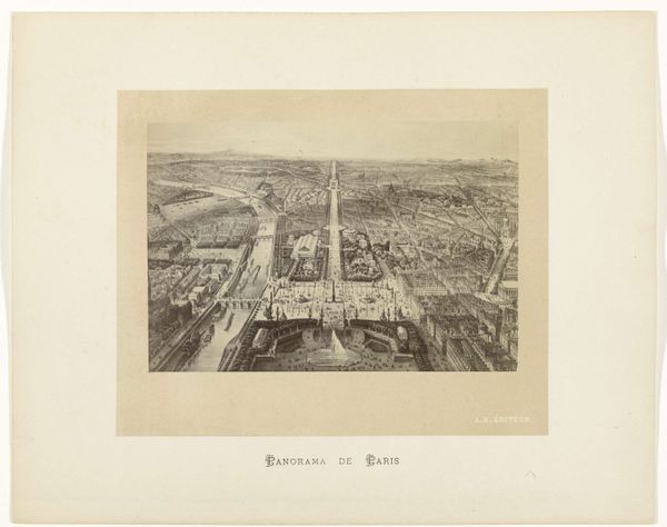 Editor: Here we have a photoproduction of a print of a panorama of Paris, dating from 1860 to 1890. The fine lines and muted tones create a sense of looking back, almost like peering into a memory. What strikes you about the composition of this piece? Curator: The intricate detail achieved through the printing technique commands attention. Consider the strategic use of line: observe how varied densities establish depth and spatial relationships. The lines defining architectural forms are sharply delineated, contrasted by the softer, almost atmospheric treatment of the distant cityscape. Editor: So, you're focusing on the relationship between the sharp details and softer lines… how do those choices affect our understanding? Curator: Precisely. The dichotomy creates a visual hierarchy. Notice also how the horizontal format allows for an extensive unfolding of space. The lines guide the eye from foreground to background. Ask yourself, how does the artist's manipulation of line weight affect your experience of depth within the composition? Editor: I see. The heavy lines ground the buildings, and the lighter ones almost fade into the distance. Does this play with perspective somehow enhance the city's grandeur, do you think? Curator: Indeed. Now consider the materiality. This is a photo-reproduction; consider the layers of mediation, where is the original? Editor: So, in exploring the relationships between detail and scale and materiality, we appreciate how the piece, quite apart from any external referent, becomes its own reality. I'll be sure to look more carefully at line work in the future. Curator: An excellent start. Continue to trust your eyes and engage in formal analysis; meaning will continue to emerge.