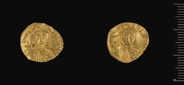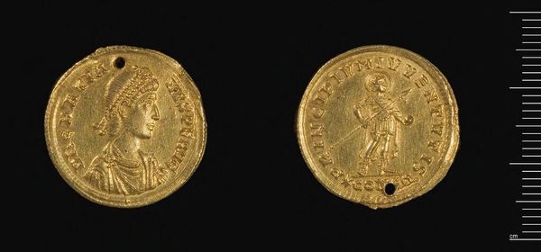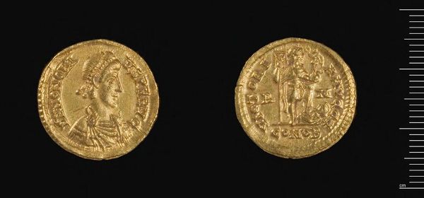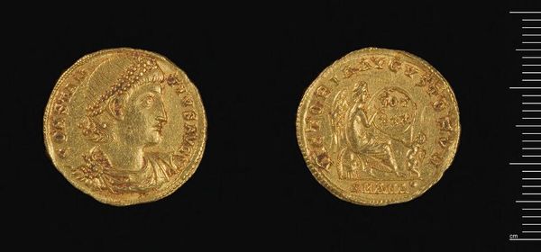 Curator: This is a solidus of Honorius, minted in Constantinople. You can see it weighs just under 4.5 grams. The artistry and symbolism packed into such a small space is truly amazing, don’t you think? Editor: Absolutely! It feels incredibly intimate, like holding a secret in your hand. The gold gives it such a weighty presence, but it’s the tiny details that really pull you in. It's like a miniature sun, both precious and powerful. Curator: Well, the image of Honorius is more than a portrait. The diadem represents his authority, the drapery signifies his imperial role, and of course the laurel wreath is a classic symbol of victory. Editor: So, it's not just about him, but about what he represents, and the whole idea of the emperor. A little propaganda, if you like. But I still find it incredibly moving to think about the hands it must have passed through. Curator: Indeed, it links us to a very different world. A potent reminder of the power of symbols to transcend time. Editor: Exactly, a tangible connection to the past, making me consider the weight of history and how it shapes our present.