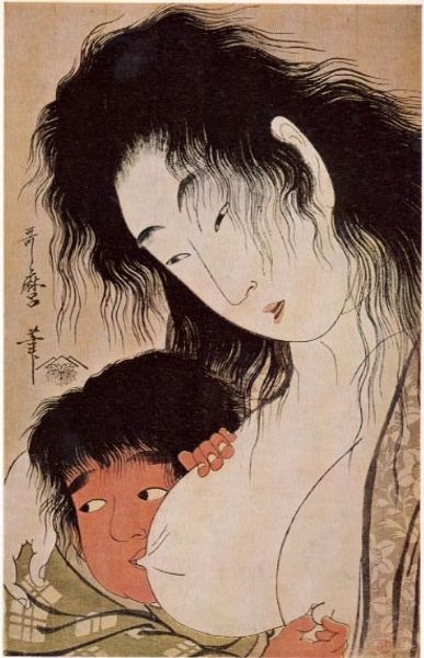 Curator: This triptych, "Ghost of Sogo's Wife" by Toyohara Kunichika, immediately evokes a sense of the uncanny with its ethereal, spectral imagery. Editor: Yes, that towering, almost serpentine figure looms with a palpable sense of dread, doesn't it? The ghostly white form contrasted against the dark hair and clothing creates such a striking visual. Curator: Kunichika created this print around the late 19th century when there was a growing public fascination with ghost stories and kabuki theater, both of which served as a form of social commentary. Editor: That dangling object above the ghost's head, the "hitodama"—it's fascinating how that single visual symbol condenses so much cultural belief about the wandering soul. Curator: Exactly, and within the context of the play, the ghost becomes a figure of vengeance, responding to social injustice, a powerful role for a female character in that period. Editor: These visual cues tap into collective anxieties about the afterlife and the potential for unresolved grievances to manifest as vengeful spirits. Curator: The enduring appeal lies in the way it combines the familiar with the supernatural, prompting reflection on social order and its discontents. Editor: Seeing it this way really underscores how art can channel and challenge cultural anxieties.