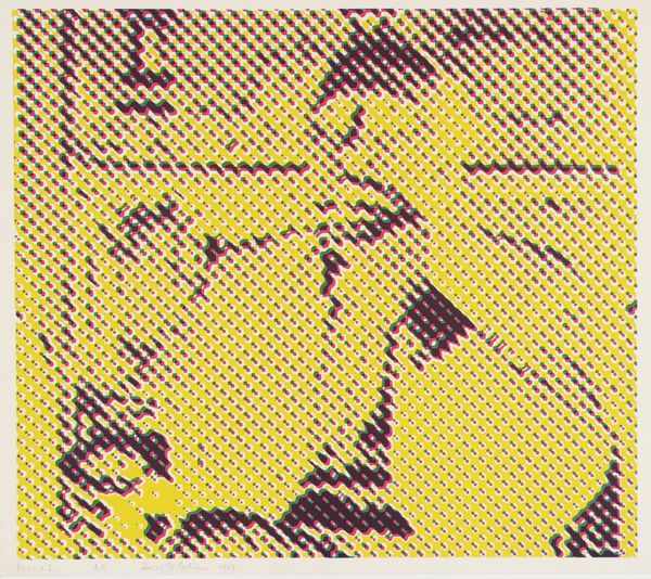 Editor: So, this is Harold Cohen's "Richard II," held at the Tate. The Ben-Day dots give it a pop art feel, but there's something about the obscured face that feels unsettling. What historical context informs this piece? Curator: The obscuring is key. Cohen was deeply interested in artificial intelligence and artmaking. This print, likely made with early computer-assisted methods, explores the role of the artist. Is it Cohen, the programmer, or the computer itself that's creating the image, and thus, meaning? Editor: So, the subject being obscured is almost secondary to the method of creation? Curator: Precisely. The “Richard II” becomes a cipher, a stand-in for the anxieties surrounding automation and artistic authorship in the late 20th century, reflecting how institutions were grappling with technology’s impact. Editor: That's fascinating. I was so focused on the visual, I missed the deeper commentary on art itself. Curator: Often, the most compelling works challenge our assumptions about where art comes from and who it serves.
