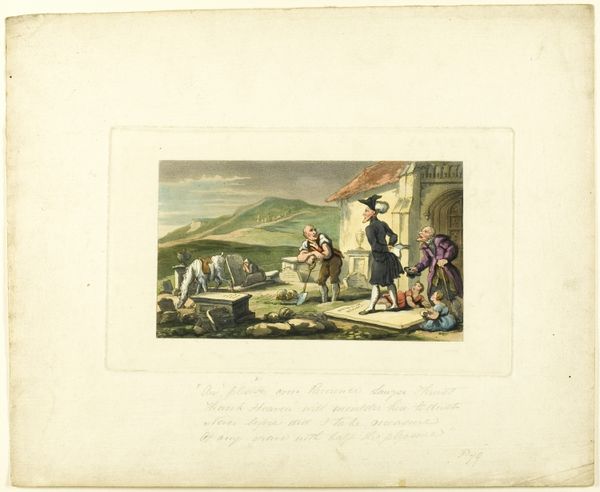 Curator: Heinrich Joseph Schütz created "Soldiers Recreating" as a print and drawing in 1798. It resides here at the Metropolitan Museum of Art. The artwork shows soldiers relaxing under a tree, but what do you make of it? Editor: Well, my immediate reaction is that this feels so staged, even sanitized. It’s not how one pictures a battlefield or encampment, that's for sure. Curator: Precisely! The image participates in the late eighteenth century obsession with genre paintings—it reflects a cultural yearning for an innocent, untroubled life. Think about the social and political turbulence of Europe at the time; revolution was in the air. It's no wonder people were drawn to this image of order and conviviality. Editor: Conviviality indeed. Notice the dancing figure, almost a classical muse with that draped gown, being serenaded by the music of her male admirers. She is invoking an idealized form, one deeply rooted in collective ideas of beauty and grace, removed from the grit of military life. What I see is an archetypal relationship between masculine admiration and feminine inspiration. Curator: That relationship is certainly deliberate. Remember, prints like this one were not just passively viewed; they were bought, traded, and circulated as propaganda. “Soldiers Recreating” isn't trying to show you war’s brutality. It promotes the benefits of military life and projects a romantic image of leisure and camaraderie as part of an aesthetic experience. Editor: But there is a quiet tension too. They seem aware of something. The background landscape fades off into infinity and the woman’s translucent gown creates movement like a ghost over the foregrounded forms of the soldiers, almost hinting that their idyllic repose may not last. Curator: That romantic aesthetic, its softness and grace, are always tinged with premonitions, as you suggest. What seems idyllic always implies something ominous hovering on the horizon. We shouldn’t forget how useful images of national strength could be, even in promoting national interest. Editor: This dance between visual symbols and historical realities gives such works a lasting potency, no? You walk away contemplating not only a historical slice-of-life, but an era’s deeply held beliefs about duty, beauty, and belonging. Curator: Yes, it’s a fascinating window into the aspirations of its time.