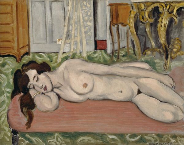 Henri Matisse made this painting of a nude on a chaise longue in oil paint. He laid down some confident marks. It’s a painting about seeing, a way of understanding the world through blocks of color, like pink skin and a dark red drape. The material quality of this painting is so direct. The canvas looks almost raw. The paint application is straightforward; you can see where the brushstrokes start and stop. Look at the way he’s painted the wall behind the figure. The roses are almost cartoonish, and the leaves are blobs of green, somehow that flattening of space makes the figure feel more present, like she’s right there in the room with us. It’s so easy to look at this as if it’s a literal depiction of a woman, but I think it’s more about Matisse’s playful process. I see a connection between this painting and some of Picasso’s later works, especially in the way both artists embraced a kind of simplified, almost childlike approach to form. Art is always evolving, and this piece reminds me that there's always room for new ways of seeing.