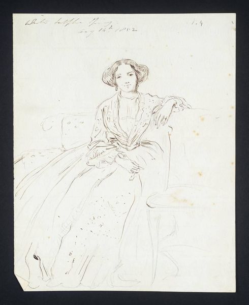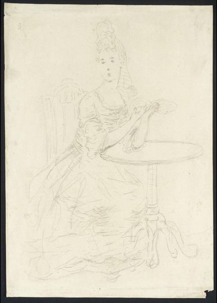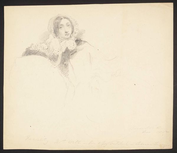 Curator: This drawing, titled "Portret van een dame", resides here at the Rijksmuseum. Created sometime between 1824 and 1845, it's attributed to Henricus Wilhelmus Couwenberg, rendered meticulously in pencil. What’s your first take on this, from an artist’s eye? Editor: Fleeting, ephemeral…like a half-remembered dream. There's a delicacy, a sense of transience to it. The soft pencil strokes give it an almost ghostly quality. What’s she trying to convey, do you think? Curator: Given the Romanticist style, and knowing such portraits often carried significant social weight, perhaps she wants to project an image of refined sensibility, innocence even. The large hat could also be indicative of her social standing. Editor: I see your point, the hat and ornate dress do hint at status. But there's also something vulnerable in her gaze. It’s not a power pose, more like she's sharing a private moment. And all that lace! Imagine the psychological weight of those restrictive fashions. Curator: That's fascinating – the layers of fabric mirroring perhaps, layers of social expectation. There is also a suggestion of Realism present, look at the facial features and attention to detail; that blend signifies both idealised beauty and grounded realism within the artwork. Editor: Exactly! And the incompleteness adds to its charm, doesn't it? It’s a fragment, a suggestion, leaving so much room for the viewer’s imagination to fill in the gaps. Makes you wonder what the story is that we aren't being told, what secrets it holds… Curator: Incomplete as it may seem, its incompleteness encourages personal readings and multiple perspectives. A testament perhaps to art's ability to evoke, suggest, and leave its own imprint on those who contemplate it. Editor: I’m left thinking about the woman behind the sketch. What were her aspirations? What was she feeling at the time she was portrayed? I feel compelled to dig deeper into what wasn't rendered, perhaps there I will discover everything.