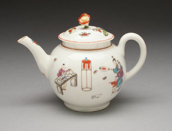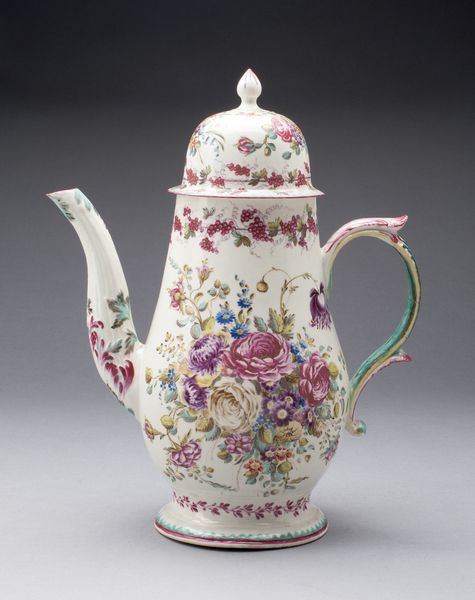 Curator: Immediately, a sense of contained opulence strikes me. The cream pot is relatively small in scale, but it achieves visual dynamism through its delicate handle, precise symmetry, and subtle polychrome palette. Editor: Yes, a wonderful example of Rococo design by the Porzellanmanufaktur Frankenthal, crafted in 1786. The materiality here is everything—the smoothness of the ceramic and the layered underglaze decoration exemplify 18th-century artisanal production at its finest. How do you see the form, separate from its material construction? Curator: I’m particularly drawn to the bands of blue and gold trim; they segment the volume in a manner reminiscent of architectural entablature. It’s a visual encoding of refinement; each component from base to knob has a specific function but blends to create a cohesive whole. It presents an idealized picture of aristocratic culture. Editor: Indeed. Porcelain itself was deeply entangled with court culture—alchemists, class aspirations, and industrial spying—not to mention its links to early global trade networks through resources like kaolin. Look at those tiny flowers and scattered strawberries; what did this decorative schema communicate to the aristocracy? Curator: Here the decoration signals the Rococo obsession with lighthearted fantasy. This sort of playful ornamentation allowed aristocratic individuals to differentiate themselves—to showcase discerning tastes. It is pure theatre, albeit one on a miniature stage. Editor: Theatre produced, of course, by legions of invisible factory workers in tightly regulated manufacture spaces—let’s not forget the underpaid artisans shaping the forms and mixing the paints by hand, crucial labor glossed over by these pretty designs. Curator: Precisely, and within those miniature details are expansive social dynamics. To me, the real achievement here lies in condensing meaning through material execution and considered composition—a porcelain artifact with remarkable rhetorical force. Editor: So, more than a mere vessel for cream; rather a receptacle brimming with material and societal implications, whispering stories from a particular place and moment in history.