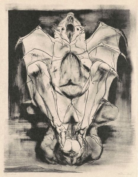 Curator: Wolfgang Paalen crafted this mixed-media piece, "Le Pterodactyle," back in 1938. The play of abstraction, surrealism, and line seems quite…enigmatic, don't you think? Editor: Eerily evocative. There's a density to its shapes that reminds me of a clouded memory struggling to surface. What materials are at play here, and how did that influence his approach? Curator: Well, mixed media implies Paalen combined various materials, perhaps to achieve that precise sense of density and form. He likely layered paint with drawing, allowing a dialogue between mediums to enrich the tactile experience. This blending undermines traditional divisions, urging us to consider labor and process over any pre-ordained aesthetic hierarchy. Editor: And what of the central image—that pterodactyl? While clearly abstract, the evocation is palpable. Pterodactyls are, of course, creatures of myth, standing at the threshold of our collective consciousness, reminding us of lost worlds. Does Paalen play with themes of cultural loss, perhaps? Curator: His biomorphic abstractions may reflect a wider social preoccupation with nature’s forms and the anxieties provoked by modernity’s relentless push towards industrialization and mass production. Are we consuming nature at an unsustainable pace? Editor: Absolutely. The spirals within the shape also cannot be overlooked; vortexes pulling at primal fears within. These circular motifs harken back to earlier forms, older symbols of creation, a cosmic memory perhaps, which creates a potent mixture. The monochromatic presentation furthers this depth of uncertainty. Curator: Paalen's employment of line work here certainly speaks volumes. This intricate linear gesture highlights the complex interplay of control and chance that typified his creative production, perhaps inviting new frameworks through which to explore modernism's cultural impact during this period. How might these visual tensions speak to social ruptures experienced under increasing industrial influence at this point? Editor: Paalen, I would argue, taps into our deep-seated psychological need for a cultural narrative, one that embraces not just rationalism but also those liminal spaces that elude definition. Its dreamlike aura prompts introspection, which stays within viewers long after they’ve moved away. Curator: His skillful combination and unusual approaches surely broadened understandings surrounding what truly shapes artistic practices of lasting significance. It brings us to consider art as labor, where creativity meets practical creation amidst ever-shifting boundaries in meaning construction through material exploration during volatile periods in recent global history. Editor: Yes, this is where he succeeds, echoing persistent anxieties while also creating the chance to dive beneath everyday life within symbolic narratives of old and modern persuasions that reflect broader trends through modern visual language.